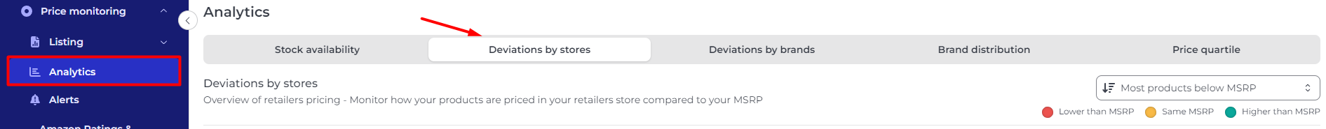 2. Durchschnittliche Abweichung: Diese Metrik zeigt die allgemeine Preisposition des Einzelhändlers im Vergleich zu Ihrem UVP, und gibt an, ob ihre Preise im Allgemeinen höher oder niedriger sind.