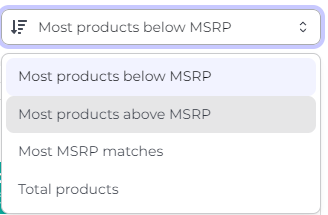 Die meisten MSRP-Übereinstimmungen: Hier sind Einzelhändler in absteigender Reihenfolge nach der Anzahl der Produkte organisiert, die mit Ihrem MSRP übereinstimmen, was es einfach macht, diejenigen zu identifizieren, die sich an Ihre Preisgestaltung halten.