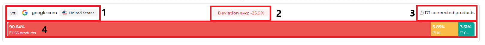3.Produktverteilungsleiste: Diese visuelle Darstellung zeigt, wie viele Ihrer Produkte im Vergleich zur Gesamtzahl der verbundenen Produkte über, auf oder unter dem MSRP liegen. Dies hilft Ihnen, Ihre Preisstrategie in Ihrem Katalog schnell zu bewerten.