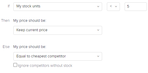 Wenn meine Produkte auf Lager weniger als 5 Einheiten sind, dann sollte mein Preis gleich bleiben, und wenn nicht, dann sollte ich gleich dem günstigsten Wettbewerber sein.