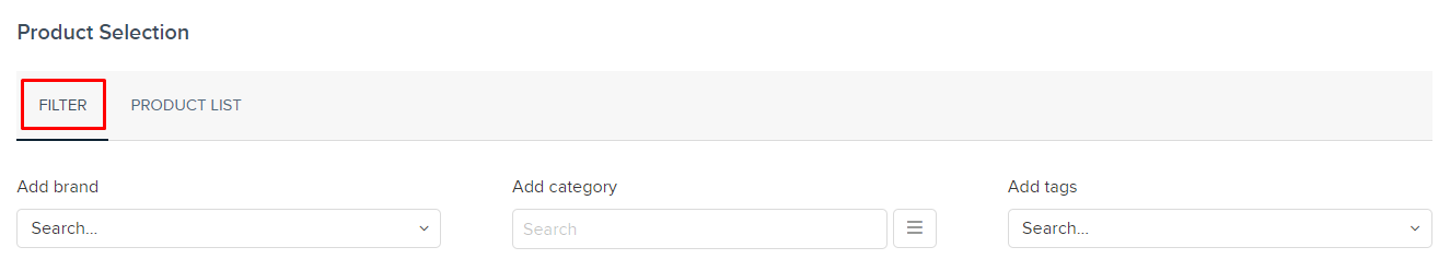 ProduktauswahlGeben Sie an, welche Kriterien diese Aktion berücksichtigen wird. Sie können Filter auf der Grundlage von Marke, Kategorie oder Tags auswählen (Sie können alle oder nur einige oder nur einen davon verwenden). Oder Sie können auch eine Aktion um eine Produktliste herum erstellen, indem Sie Produkte entweder nach Produktname oder EAN/Code auswählen (WICHTIG!! bis zu 200 Produkte, für mehr als diese Anzahl verwenden Sie Tags wie oben erwähnt). Das System ermöglicht es Ihnen, die Produkte zu finden, die Sie der Liste hinzufügen möchten, nach Titel, Referenzen und anderen verfügbaren Attributen.
