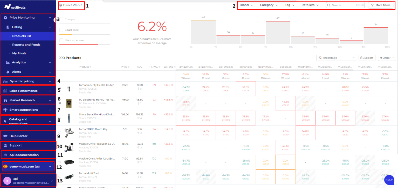 - Listing: Compare retailer prices against your MSRP to see who sells below, at, or above recommended prices.
