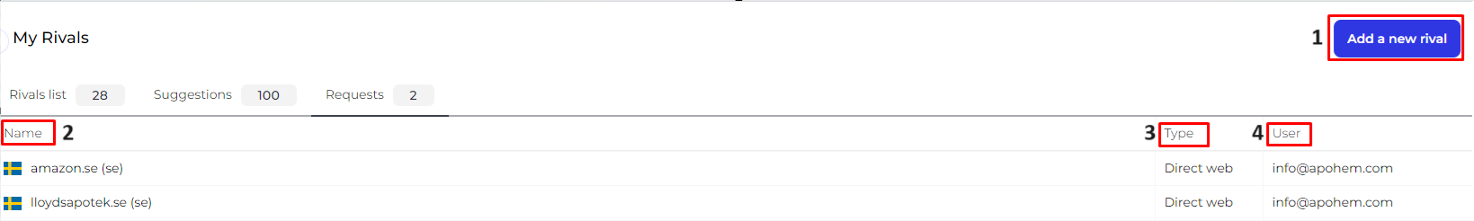 1. Add new rival: You can use the button in order to add more retailers you wish to follow. Send a request and CSM team or support will reach you to help you out in the process