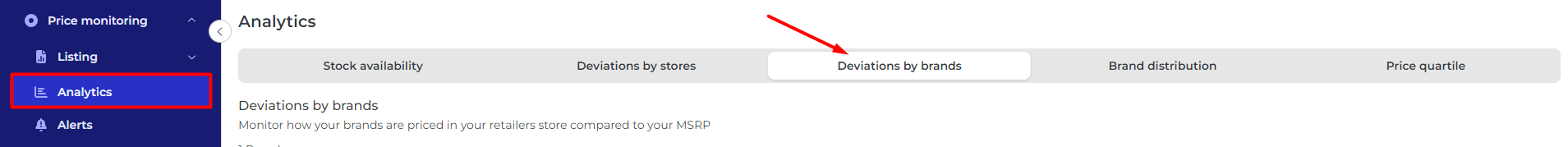 This module is accesible from Price monitoring > Analytics> Deviations by brands
