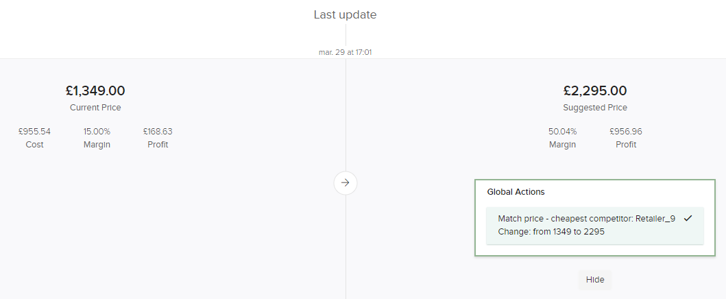 • If you click on Details, you will see what rules have been applied to calculate that specific price suggestion. Likewise, here you’ll find why some products that have not yielded any price suggestions.