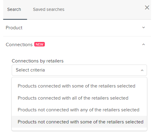 If you go to ‘Advanced’ in the upper right corner, you will see that we can filter by Connections. These filters will help you easily locate which products are not connected, so you can focus on them and increase connections, either manually or through Smart Connections.