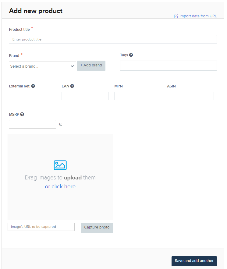 You need to add the product title, select the brand of that product and add tags if you need to. Then we recommend you to add the external reference, the EAN code or the MPN. If you don’t, an automatic code will be created for that product. The ASIN code is optional. Finally, you can enter the MSRP for that product in question. As well as images of it.