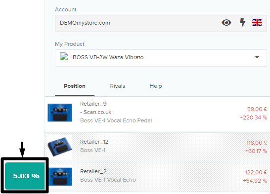 - Price information is displayed in a very intuitive way allowing you to check which retailers are positioned over or below prices of your catalog.