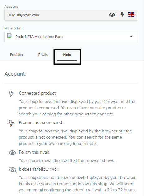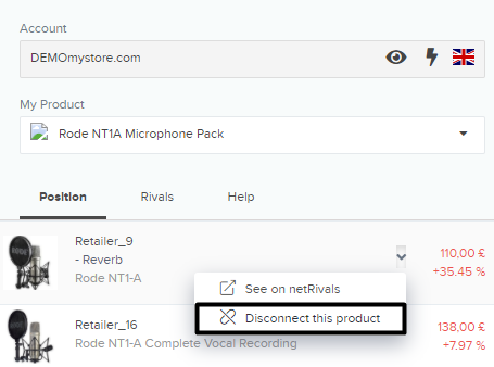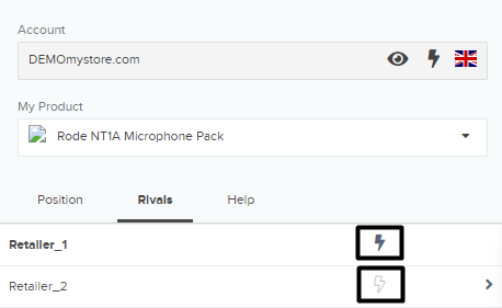 - If you click on ‘Rivals’ tab, you’ll see to which retailers the product in question is connected. If you are in the page of a product that has already been connected, the thunder symbol is bold. If the symbol is white, it means that is not connected to that specific retailer.