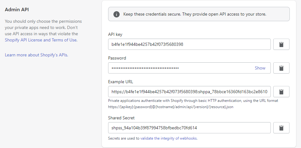 In order for Netrivals to be able to automatically read your products, you have to share with us the API Key, the Password and the Shared secret.