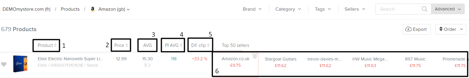 4: PI AVG: Un promedio de todos los precios y cómo se comparan con el tuyo. Este índice puede estar por debajo o por encima del 100%. Cuando se establece por debajo, significa que el producto se está vendiendo por vendedores a un precio promedio que es inferior al precio que has establecido. Del mismo modo, cuando ese índice está por encima del 100%, significa que los competidores están vendiendo a un precio promedio que es superior a tu precio. Finalmente, si el producto se está vendiendo por otros vendedores a un igual o similar precio al tuyo, el porcentaje estará cerca del 100%. En este punto, ten en cuenta que el PI AVG siempre es un promedio, por lo que puede suceder que el PI promedio de un producto esté por encima de 100, pero aún hay algunos vendedores que pueden estar vendiendo este producto específico por debajo del precio promedio del mercado.