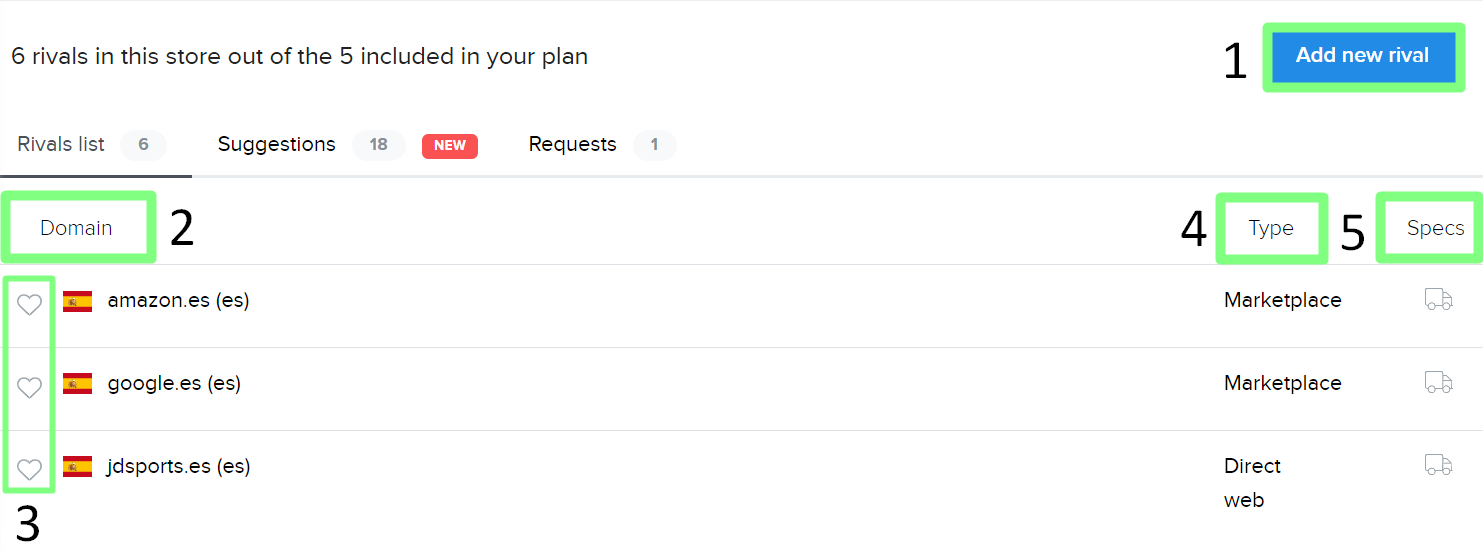 1. Añadir nuevo rival: Puedes usar el botón para añadir más minoristas que deseas seguir, siempre que no hayas alcanzado tu límite. En caso de que hayas alcanzado ese límite, necesitarás contactar con el especialista de Atención al Cliente responsable de tu cuenta.