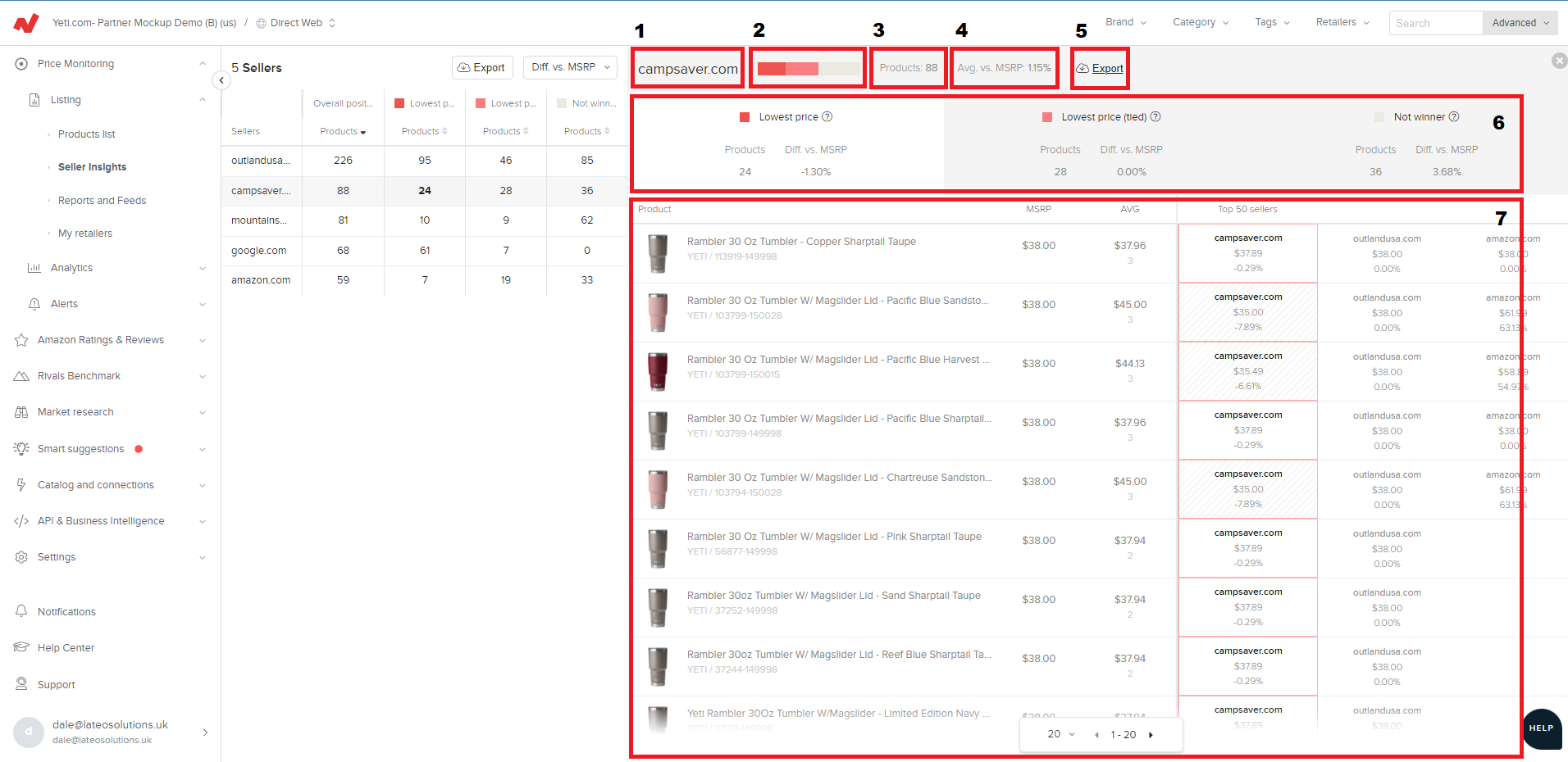 Como marca, necesitarás saber cómo están posicionados tus minoristas en el mercado en relación con los precios, y cuáles venden a los precios más bajos, comparten el precio más barato o mantienen un precio más alto. Esta pantalla contiene diferentes secciones: