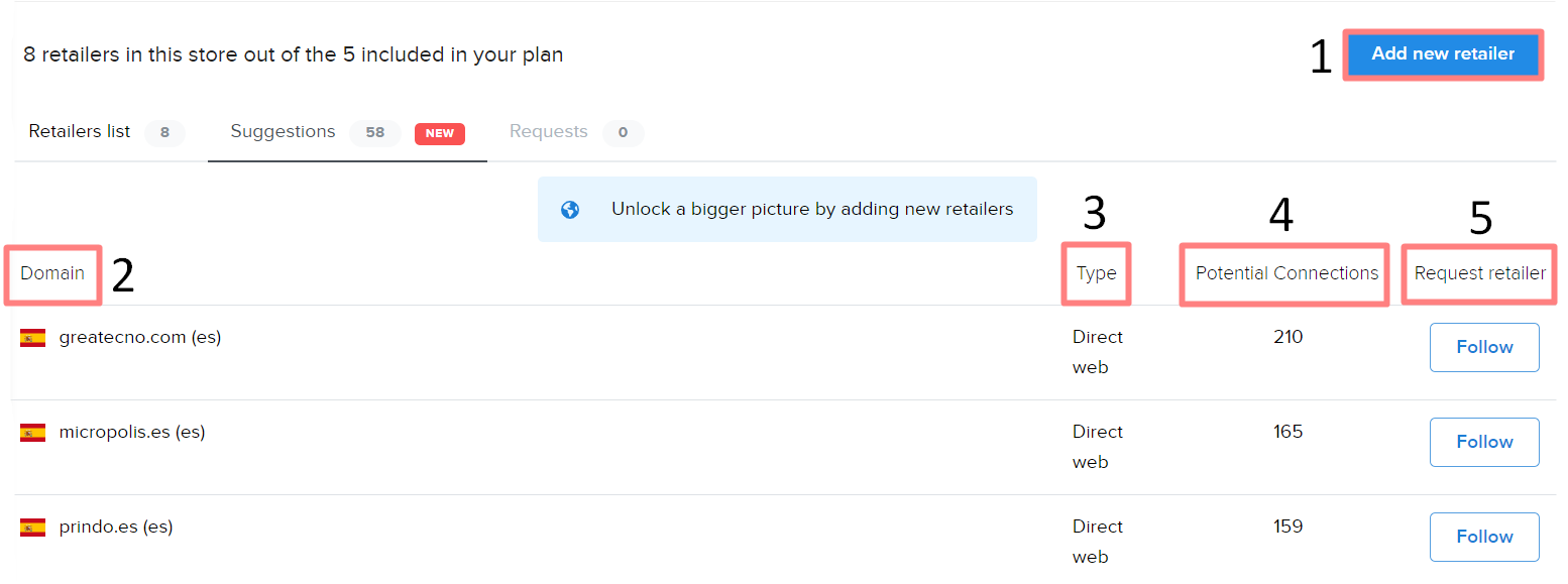 1. Agregar nuevo retailer: Puedes usar el botón para agregar más retailers que deseas seguir, siempre que no hayas alcanzado tu límite. En caso de que hayas alcanzado ese límite, necesitarás contactar a tu especialista de Atención al Cliente responsable de tu cuenta.