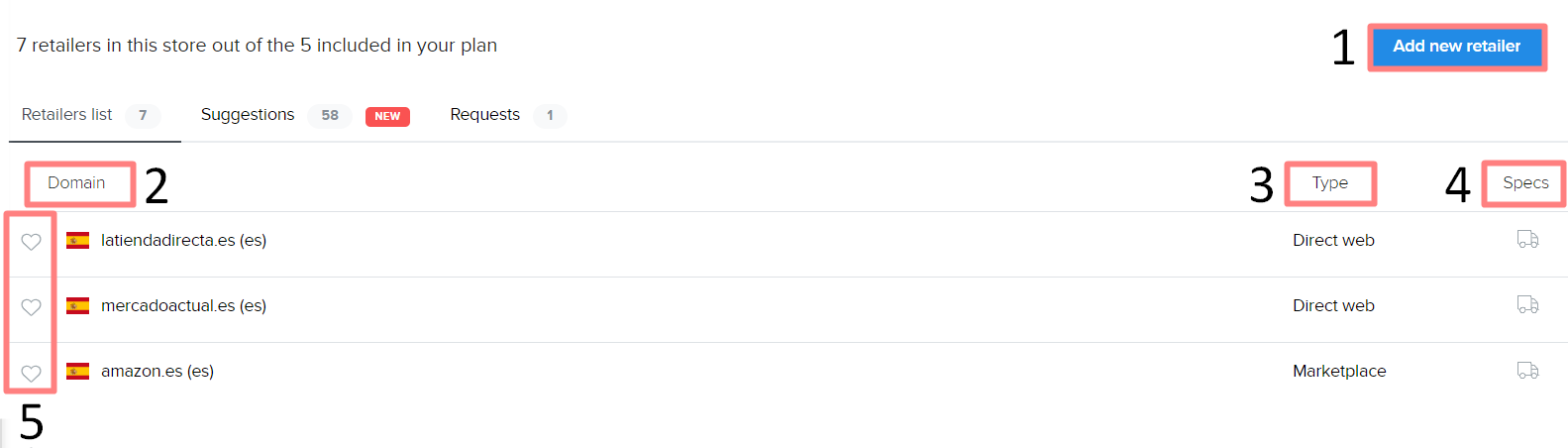 5. Corazón gris: Puedes marcar a los retailers como favoritos haciendo clic en el corazón a la izquierda de cada uno de ellos. Esta funcionalidad es útil si tienes la intención de realizar búsquedas y crear informes basados en vendedores favoritos.