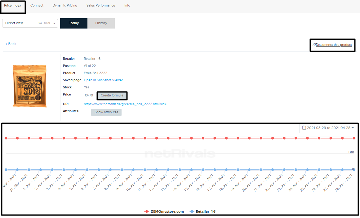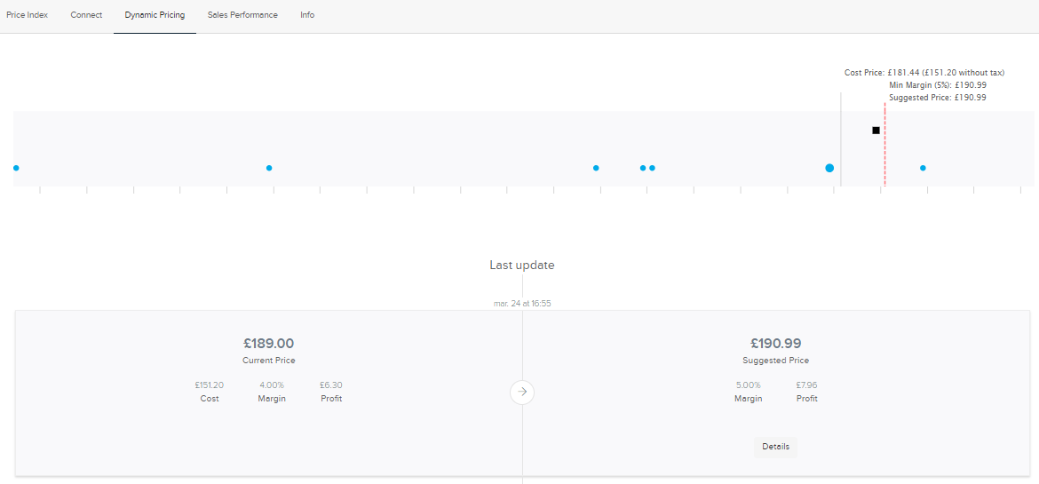 Depuis l'onglet Tarification Dynamique, vous voyez de manière visuelle la situation de votre produit par rapport à vos concurrents. De plus, le graphique montre votre position actuelle des produits et le prix suggéré fait par le logiciel Netrivals.