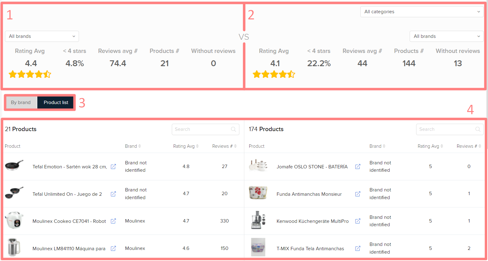 2. Aperçu des évaluations et des avis de vos concurrents. Dans cette section, vous pouvez comparer votre marque avec d'autres marques concurrentes appartenant à la même catégorie de produits. Vous pouvez voir les mêmes informations que dans la Section 1, mais concernant d'autres marques, et filtrer par catégorie.