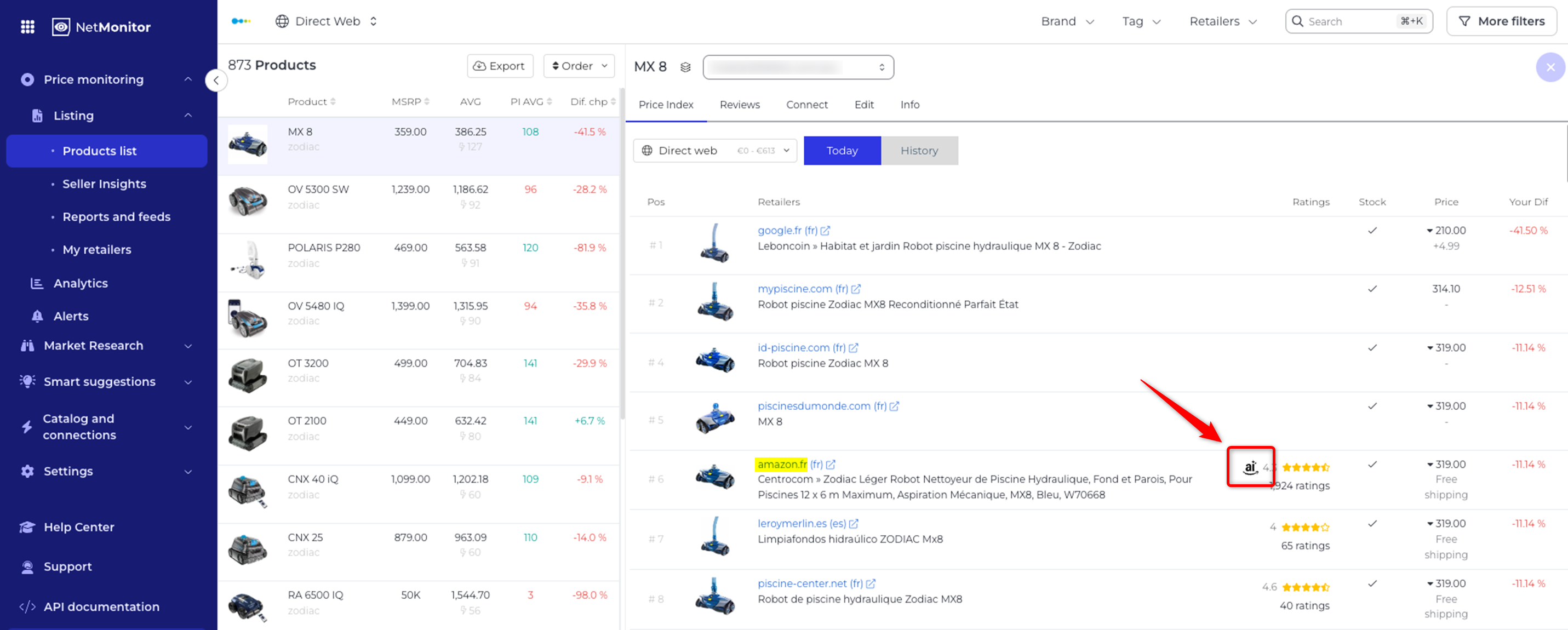 Sur la plateforme NetRivals / NetMonitor, l'icône "ai" est affichée sur la page de détail du produit si le résumé IA est disponible :