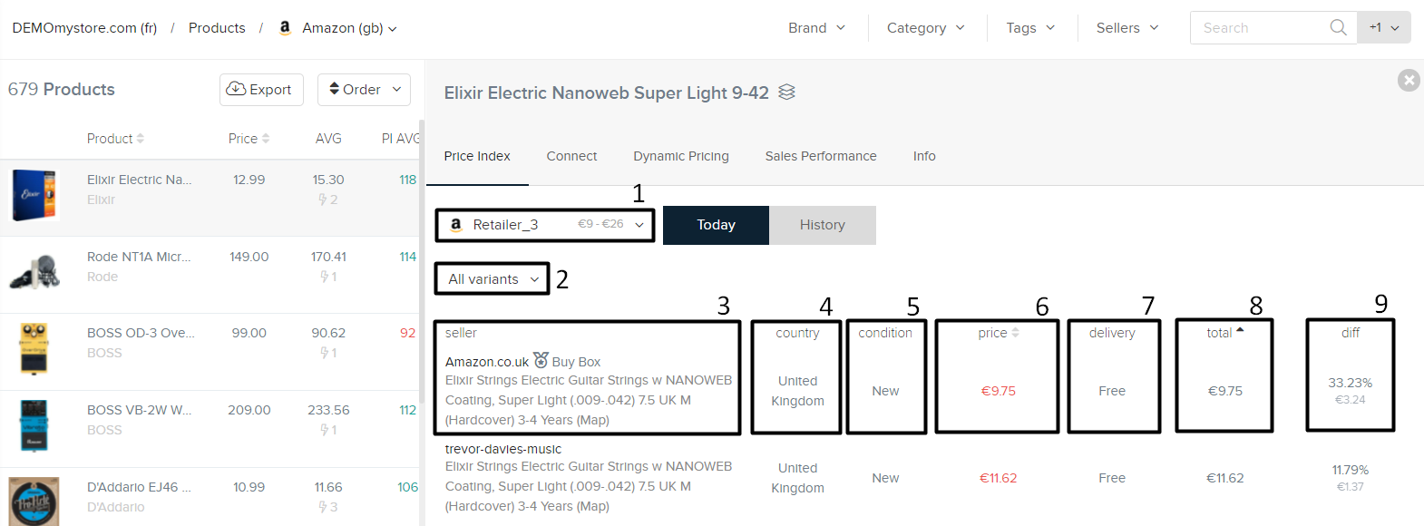 9. Differenza (diff): La differenza tra il tuo prezzo/MSRP e il prezzo di ciascun venditore, sia in percentuale che in euro (o valuta considerata nel tuo account).