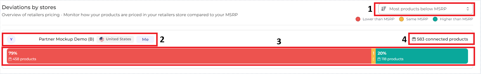 4.Distribuzione del prodotto per rivenditore: Questo elemento visivo illustra quanti dei tuoi prodotti sono prezzati sopra, al, o sotto il MSRP, rispetto al numero totale di prodotti collegati a quel rivenditore. Fornisce una rapida panoramica delle tendenze dei prezzi e della competitività all'interno di quel specifico ambiente di vendita al dettaglio.
