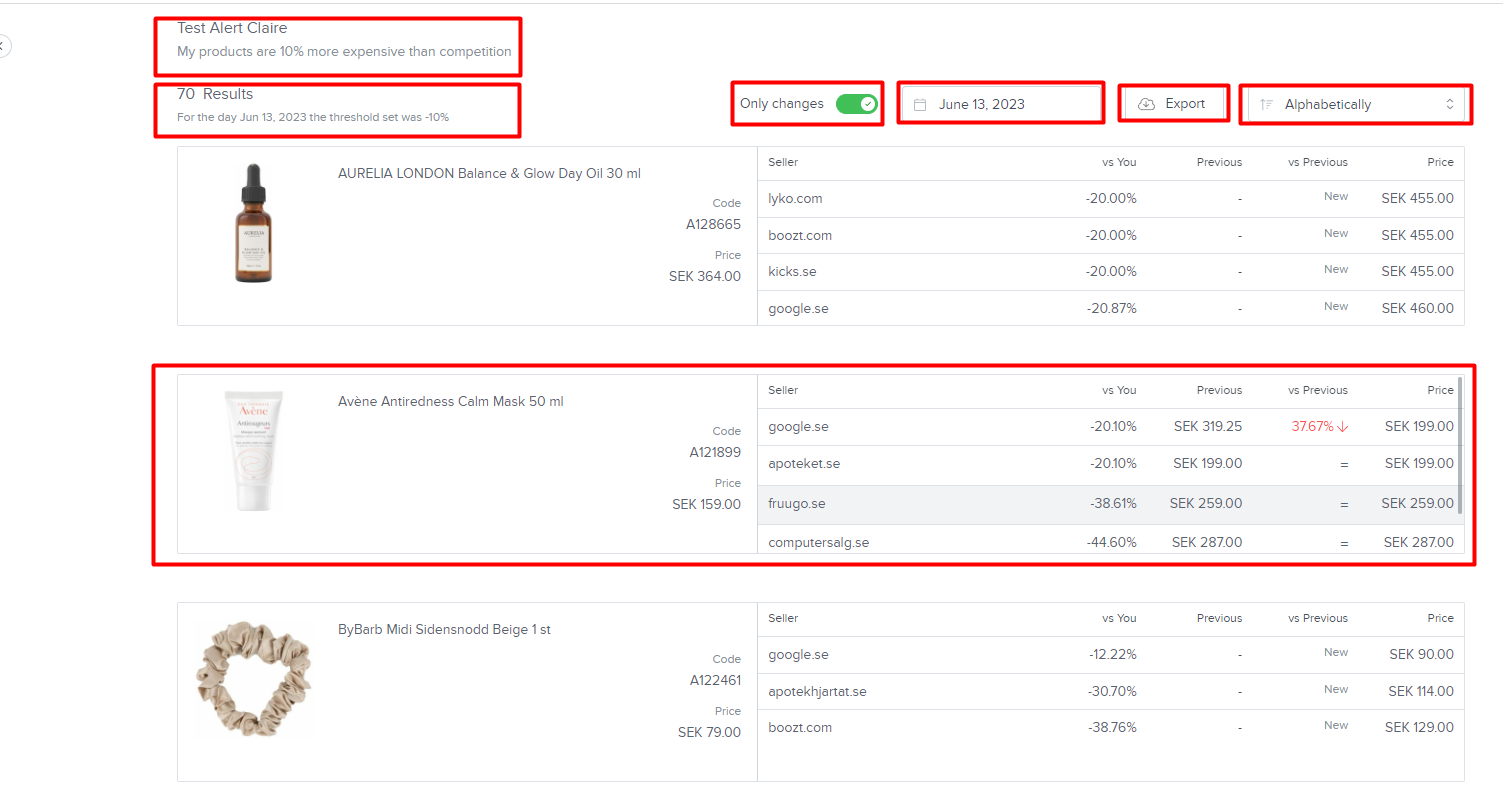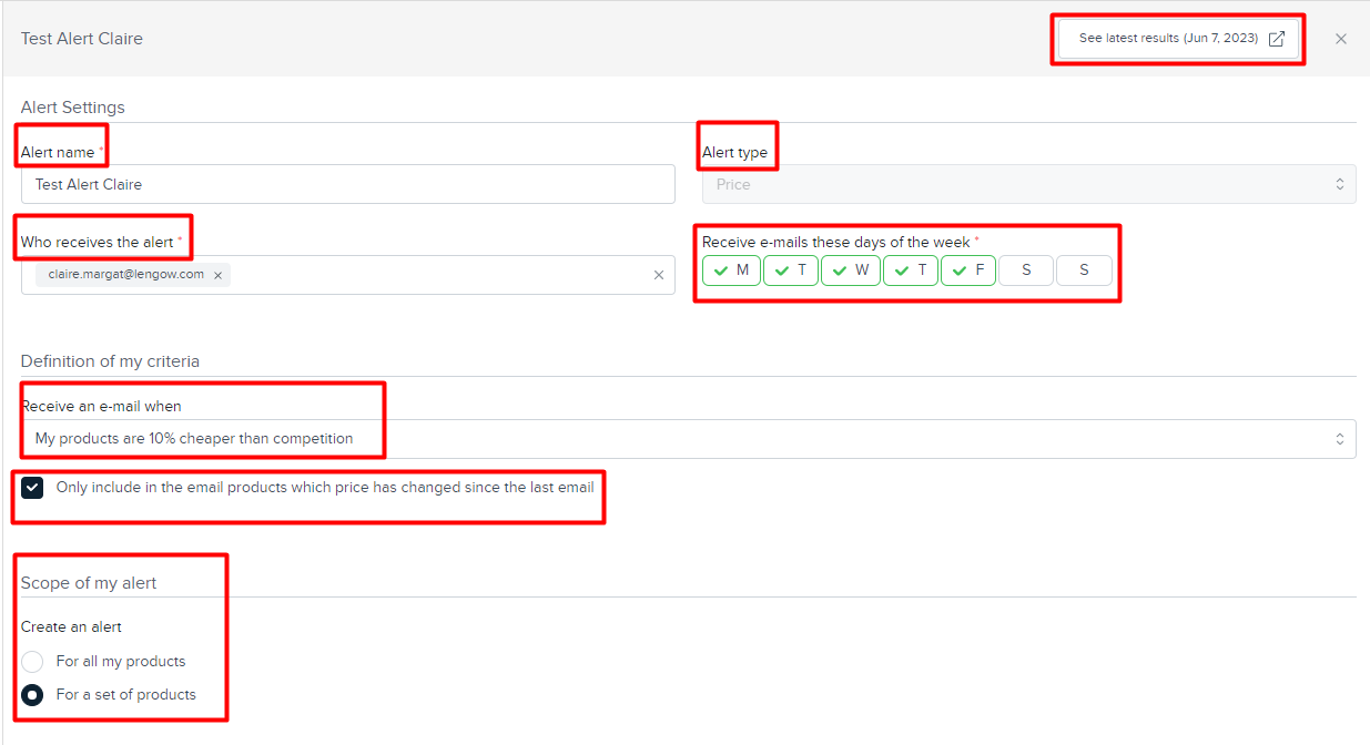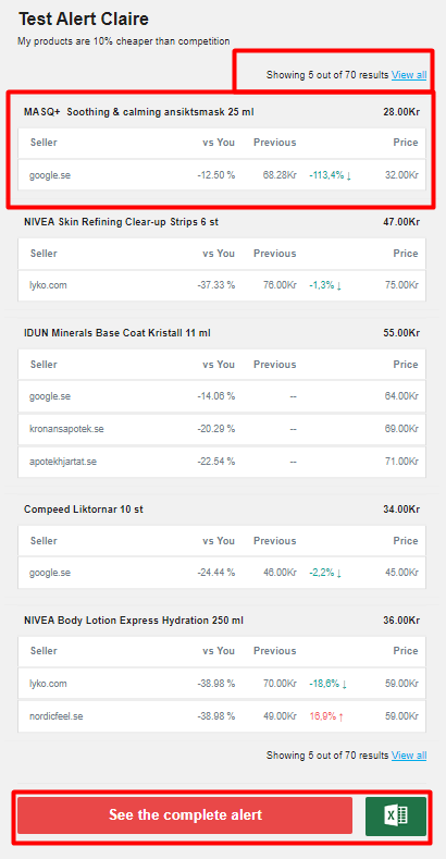 La notifica email ricevuta contiene il nome dell'avviso e i criteri inclusi, così come l'elenco dei prodotti inclusi nello stesso. Puoi anche vedere i differenziali di prezzo rispetto ai concorrenti che segui. Puoi controllare l'intero avviso e modificarlo cliccando su di esso dalla pagina degli avvisi.