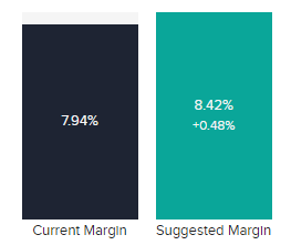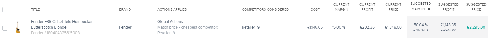 Sulla destra, puoi vedere il prezzo suggerito da Netrivals, la percentuale e l'importo del margine di profitto che otterresti se applicassi quel suggerimento.