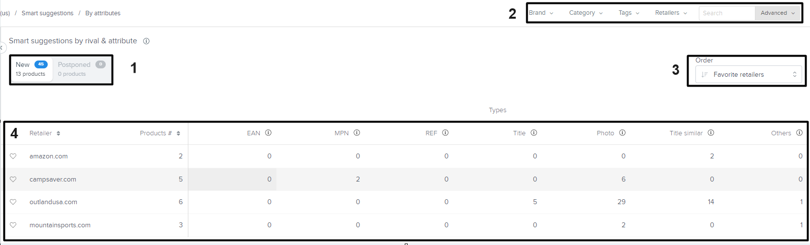 Questa opzione suggerirà un prodotto dal tuo catalogo rispetto a un prodotto specifico di un rivale. Questa è una buona opzione se stai pensando di collegare i tuoi prodotti in blocco. Le informazioni da valutare sono visualizzate nella griglia sottostante: