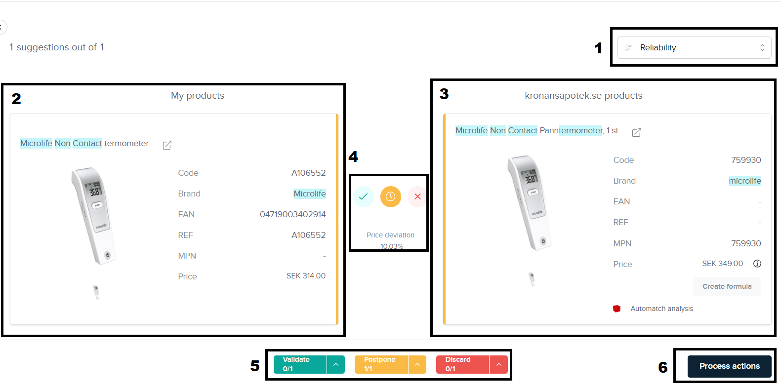Questi suggerimenti per le corrispondenze si basano su riferimenti simili diversi dal codice EAN. In situazioni in cui vengono trovati codici EAN identici, il sistema abbina automaticamente i prodotti, dato che questo tipo di riferimento è inequivocabile.