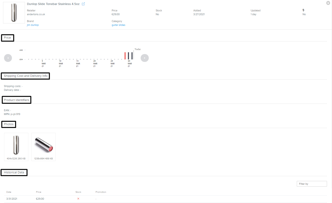 Prezzo: Viene visualizzata una cronologia dei prezzi se il prodotto è collegato (linea tratteggiata) e il prezzo del concorrente è sulla barra