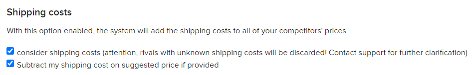 如果您点击第一个选项,运输费用将被添加到产品价格中。请注意,如果竞争对手没有公布运输费用,我们将从动态定价中排除此竞争对手。