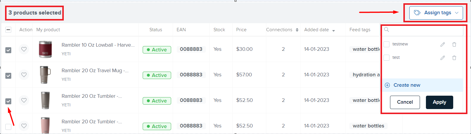 从这里,您可以命名您想要创建的标签,并点击创建新的。然后,这个标签将被分配给您选择的产品(或选择一个已经创建的),您可以将其分配给您需要的任何数量。