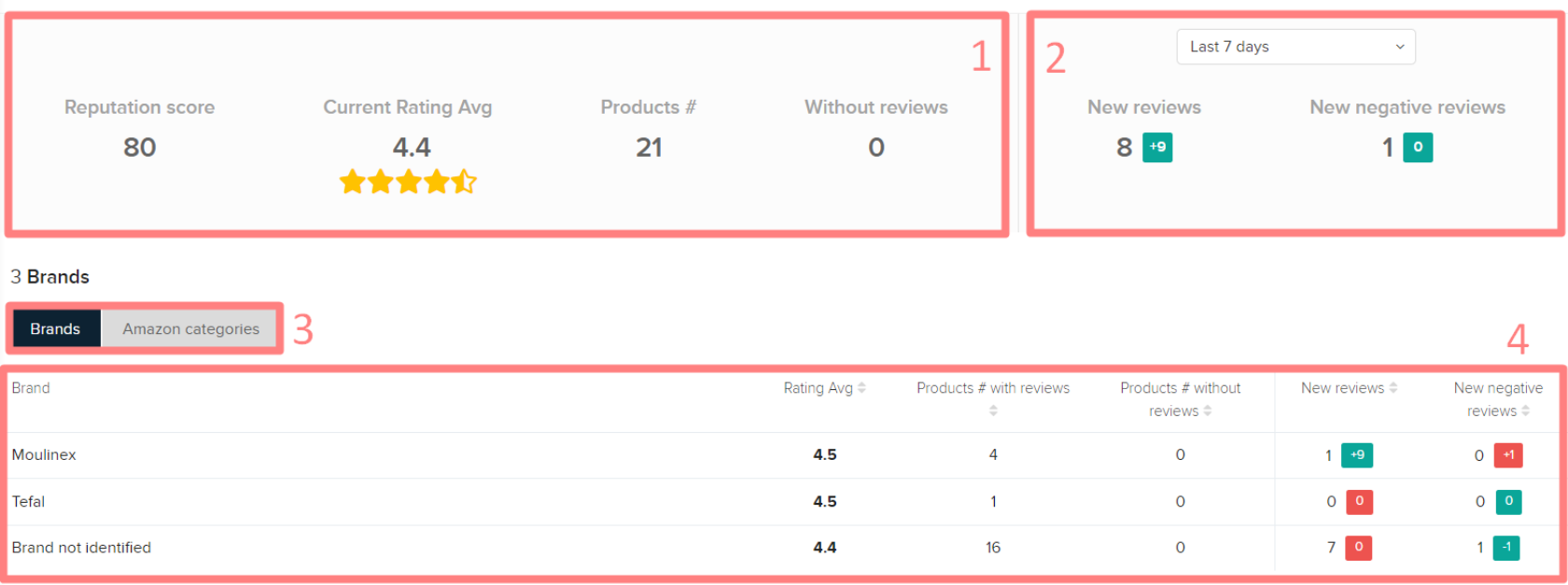 考虑到亚马逊的品牌和产品类别:1. 您的产品评级和评论概览。在这里,您将看到您在亚马逊所有产品的平均评级,其中有多少百分比的产品评级低于4星,评论平均数(所有评论除以产品数量),产品总数,以及没有评论的产品。您可以按品牌筛选以查看特定信息。