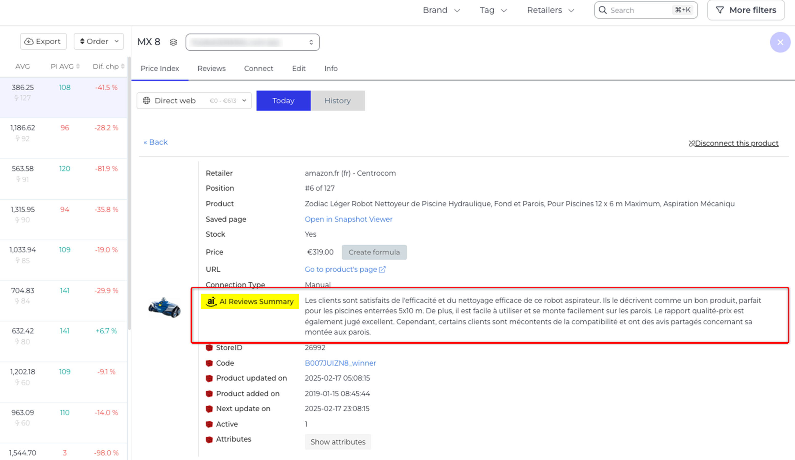 在NetRivals / NetMonitor平台上,如果AI摘要可用,产品详细信息页面会显示"AI"图标:
